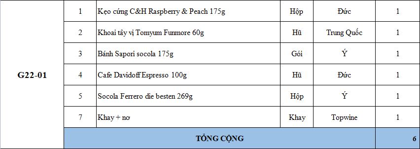 Các thành phần bao gồm: bánh kẹo, trà, cà phê, mứt, giỏ quà, hộp quà, nơ, ruy băng & rượu trong phần quà tặng đôi khi có thể bán hết hàng mà chúng tôi chưa kịp cập nhật. Nếu điều này xảy ra, chúng tôi sẽ xác nhận với bạn và luôn thay thế bằng các sản phẩm có giá trị tương đương hoặc lớn hơn.