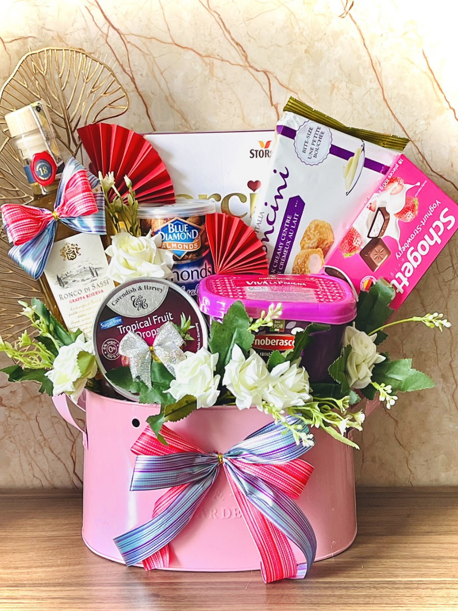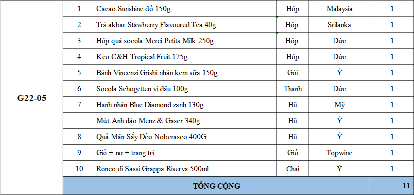 Các thành phần bao gồm: bánh kẹo, trà, cà phê, mứt, giỏ quà, hộp quà, nơ, ruy băng & rượu trong phần quà tặng đôi khi có thể bán hết hàng mà chúng tôi chưa kịp cập nhật. Nếu điều này xảy ra, chúng tôi sẽ xác nhận với bạn và luôn thay thế bằng các sản phẩm có giá trị tương đương hoặc lớn hơn.