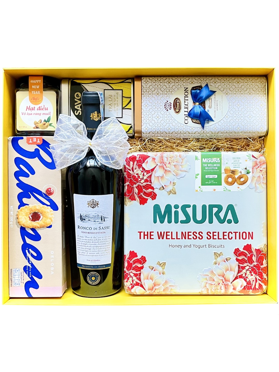 Trải nghiệm phần quà tặng gồm rượu và bánh mứt tuyệt đẹp này bao gồm chai rượu vang Ý - Ronco Di Sassi Vino Rosso.