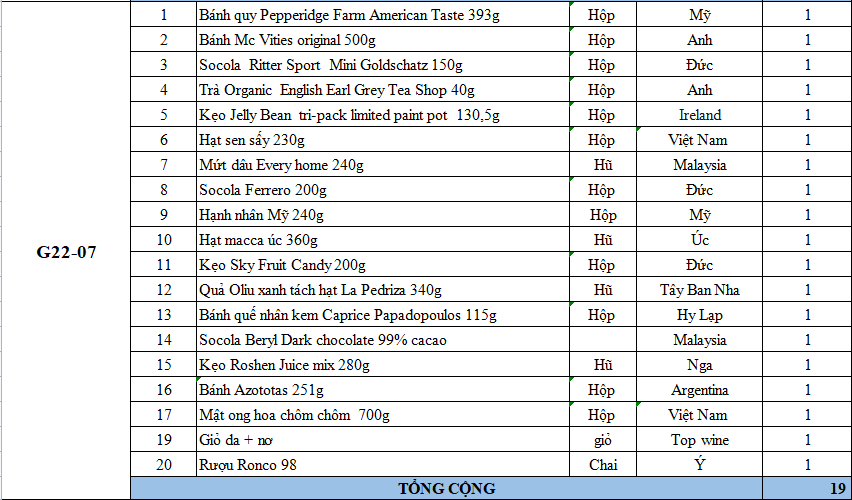 Các thành phần bao gồm: bánh kẹo, trà, cà phê, mứt, giỏ quà, hộp quà, nơ, ruy băng & rượu trong phần quà tặng đôi khi có thể bán hết hàng mà chúng tôi chưa kịp cập nhật. Nếu điều này xảy ra, chúng tôi sẽ xác nhận với bạn và luôn thay thế bằng các sản phẩm có giá trị tương đương hoặc lớn hơn.