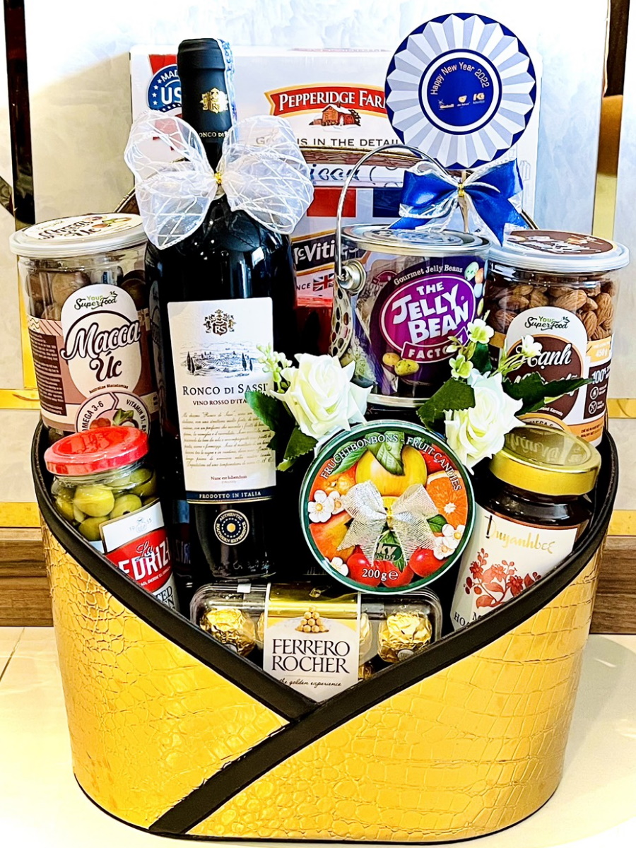 Loại rượu vang này kết hợp hoàn hảo với một giỏ quà hiện đại đẹp mắt cực kỳ sang trọng trong đó bánh, kẹo, cà phê đều được chọn từ các thương hiệu cao cấp, uy tín. Các loại hạt được dùng trong phần quà là các hạt organic đầy đủ dinh dưỡng, lành mạnh và đảm bảo an toàn cho sức khỏe. Tất cả đều được chọn lọc cẩn thận kỹ lưỡng và kiểm soát chặt chẽ về nguồn gốc xuất xứ. Điều đó kết hợp tạo nên một món quà tuyệt vời!