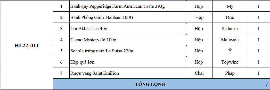Các thành phần bao gồm: bánh kẹo, trà, cà phê, mứt, giỏ quà, hộp quà, nơ, ruy băng & rượu trong phần quà tặng đôi khi có thể bán hết hàng mà chúng tôi chưa kịp cập nhật. Nếu điều này xảy ra, chúng tôi sẽ xác nhận với bạn và luôn thay thế bằng các sản phẩm có giá trị tương đương hoặc lớn hơn.