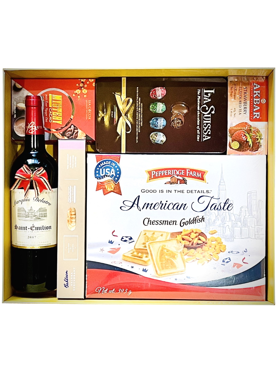 Trải nghiệm phần quà tặng rượu vang tuyệt đẹp này bao gồm chai vang Pháp - Marquis Delatre Saint Emilion.