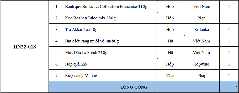 Các thành phần bao gồm: bánh kẹo, trà, cà phê, mứt, giỏ quà, hộp quà, nơ, ruy băng & rượu trong phần quà tặng đôi khi có thể bán hết hàng mà chúng tôi chưa kịp cập nhật. Nếu điều này xảy ra, chúng tôi sẽ xác nhận với bạn và luôn thay thế bằng các sản phẩm có giá trị tương đương hoặc lớn hơn.