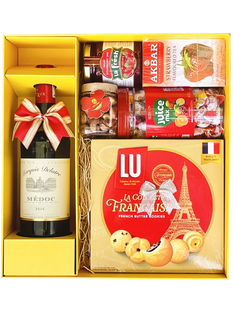 Trải nghiệm phần quà tặng rượu vang tuyệt đẹp này bao gồm chai vang Pháp - Marquis Delatre Medoc.