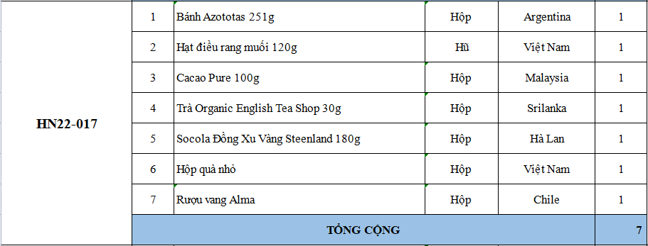 Các thành phần bao gồm: bánh kẹo, trà, cà phê, mứt, giỏ quà, hộp quà, nơ, ruy băng & rượu trong phần quà tặng đôi khi có thể bán hết hàng mà chúng tôi chưa kịp cập nhật. Nếu điều này xảy ra, chúng tôi sẽ xác nhận với bạn và luôn thay thế bằng các sản phẩm có giá trị tương đương hoặc lớn hơn.