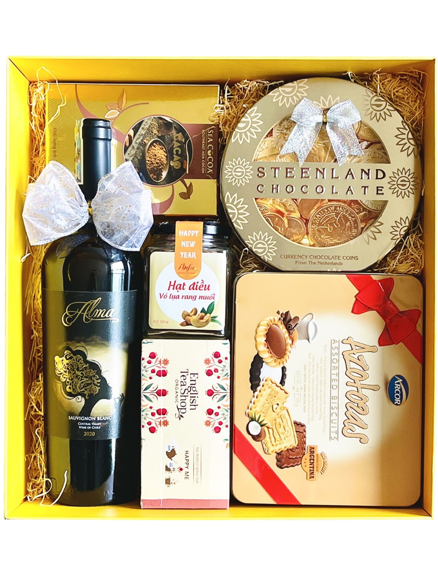 Loại rượu vang này kết hợp hoàn hảo với một giỏ quà hiện đại, đẹp mắt cực kỳ sang trọng trong đó bánh, kẹo, mứt, cà phê đều được chọn từ các thương hiệu cao cấp, uy tín. Các loại hạt được dùng trong phần quà là các hạt organic đầy đủ dinh dưỡng, lành mạnh và đảm bảo an toàn cho sức khỏe. Tất cả đều được chọn lọc cẩn thận kỹ lưỡng và kiểm soát chặt chẽ về nguồn gốc xuất xứ. Điều đó kết hợp tạo nên một món quà tuyệt vời!