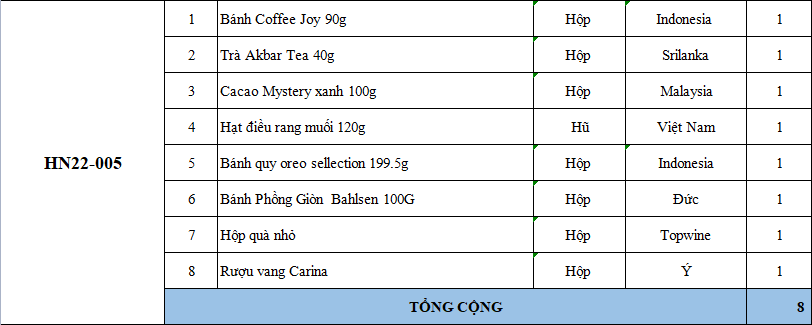 Các thành phần bao gồm: bánh kẹo, trà, cà phê, mứt, giỏ quà, hộp quà, nơ, ruy băng & rượu trong phần quà tặng đôi khi có thể bán hết hàng mà chúng tôi chưa kịp cập nhật. Nếu điều này xảy ra, chúng tôi sẽ xác nhận với bạn và luôn thay thế bằng các sản phẩm có giá trị tương đương hoặc lớn hơn.