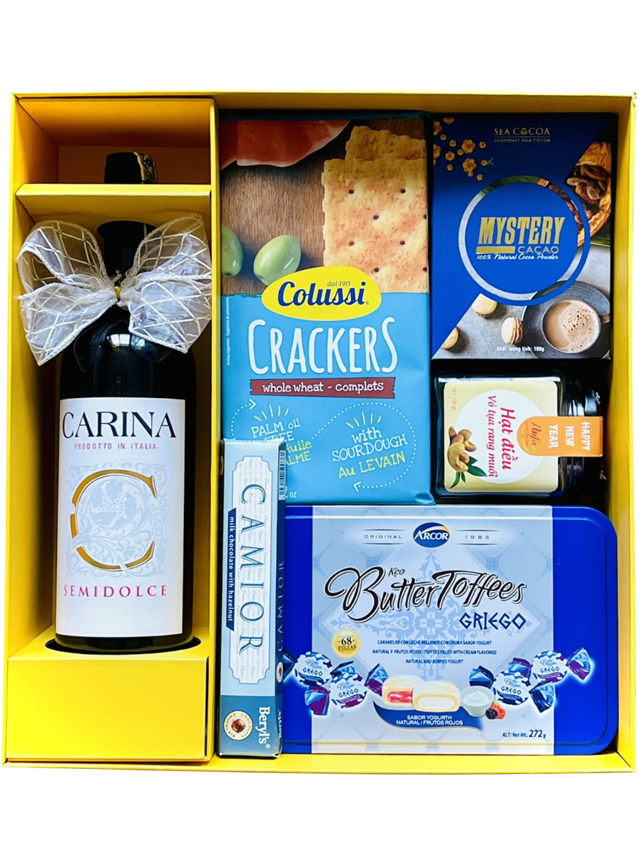 Loại rượu vang này kết hợp hoàn hảo với một giỏ quà hiện đại, đẹp mắt cực kỳ sang trọng trong đó bánh, kẹo, mứt, cà phê đều được chọn từ các thương hiệu cao cấp, uy tín. Các loại hạt được dùng trong phần quà là các hạt organic đầy đủ dinh dưỡng, lành mạnh và đảm bảo an toàn cho sức khỏe. Tất cả đều được chọn lọc cẩn thận kỹ lưỡng và kiểm soát chặt chẽ về nguồn gốc xuất xứ. Điều đó kết hợp tạo nên một món quà tuyệt vời!