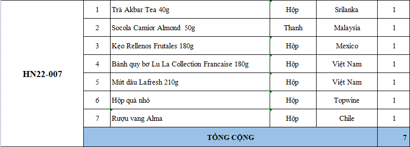 Các thành phần bao gồm: bánh kẹo, trà, cà phê, mứt, giỏ quà, hộp quà, nơ, ruy băng & rượu trong phần quà tặng đôi khi có thể bán hết hàng mà chúng tôi chưa kịp cập nhật. Nếu điều này xảy ra, chúng tôi sẽ xác nhận với bạn và luôn thay thế bằng các sản phẩm có giá trị tương đương hoặc lớn hơn.