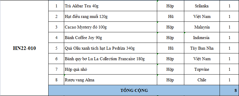 Các thành phần bao gồm: bánh kẹo, trà, cà phê, mứt, giỏ quà, hộp quà, nơ, ruy băng & rượu trong phần quà tặng đôi khi có thể bán hết hàng mà chúng tôi chưa kịp cập nhật. Nếu điều này xảy ra, chúng tôi sẽ xác nhận với bạn và luôn thay thế bằng các sản phẩm có giá trị tương đương hoặc lớn hơn.