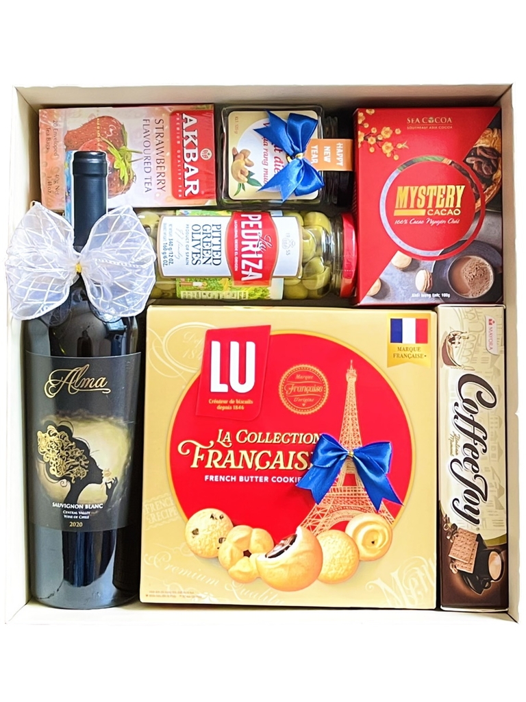 Loại rượu vang này kết hợp hoàn hảo với một giỏ quà hiện đại, đẹp mắt cực kỳ sang trọng trong đó bánh, kẹo, mứt, cà phê đều được chọn từ các thương hiệu cao cấp, uy tín. Các loại hạt được dùng trong phần quà là các hạt organic đầy đủ dinh dưỡng, lành mạnh và đảm bảo an toàn cho sức khỏe. Tất cả đều được chọn lọc cẩn thận kỹ lưỡng và kiểm soát chặt chẽ về nguồn gốc xuất xứ. Điều đó kết hợp tạo nên một món quà tuyệt vời!
