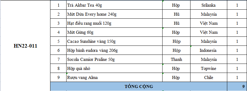 Các thành phần bao gồm: bánh kẹo, trà, cà phê, mứt, giỏ quà, hộp quà, nơ, ruy băng & rượu trong phần quà tặng đôi khi có thể bán hết hàng mà chúng tôi chưa kịp cập nhật. Nếu điều này xảy ra, chúng tôi sẽ xác nhận với bạn và luôn thay thế bằng các sản phẩm có giá trị tương đương hoặc lớn hơn.