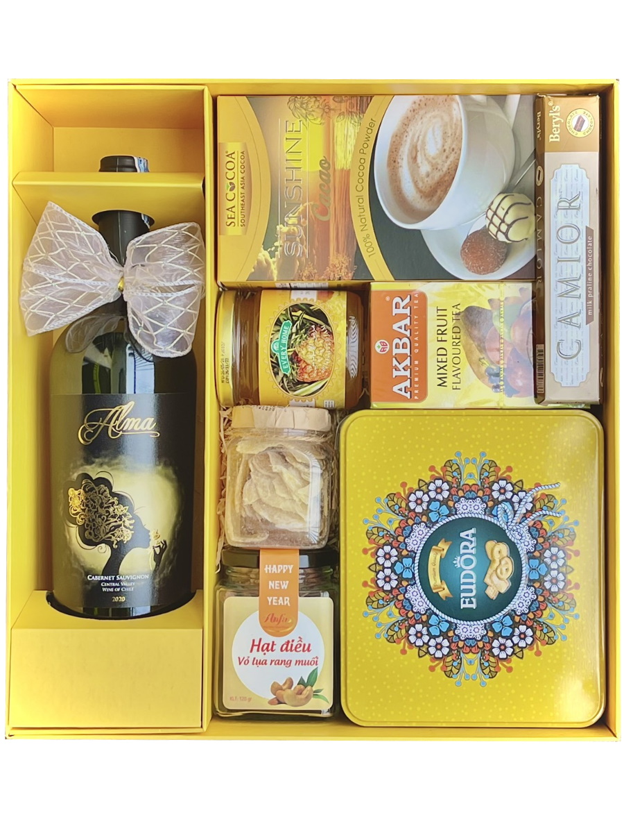 Loại rượu vang này kết hợp hoàn hảo với một giỏ quà hiện đại, đẹp mắt cực kỳ sang trọng trong đó bánh, kẹo, mứt, cà phê đều được chọn từ các thương hiệu cao cấp, uy tín. Tất cả đều được chọn lọc cẩn thận kỹ lưỡng và kiểm soát chặt chẽ về nguồn gốc xuất xứ. Điều đó kết hợp tạo nên một món quà tuyệt vời!