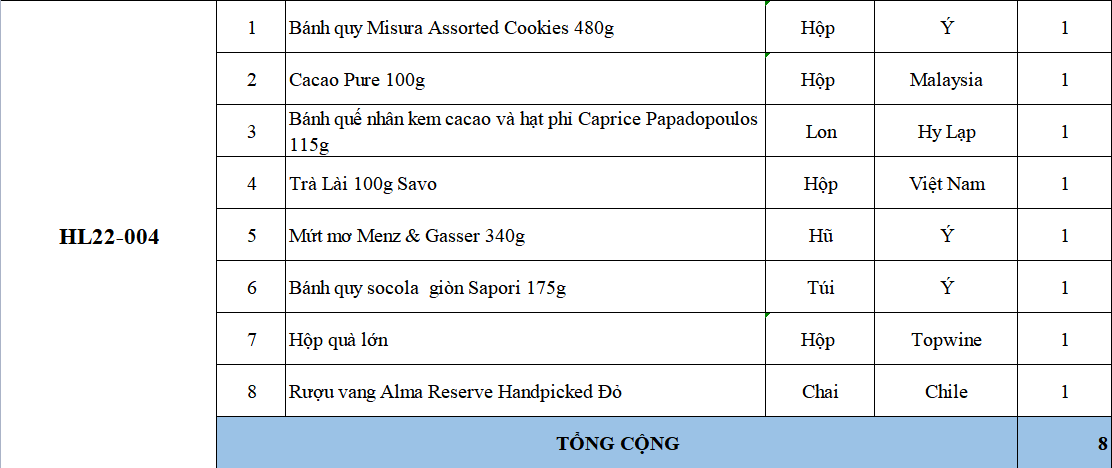 Các thành phần bao gồm: bánh kẹo, trà, cà phê, mứt, giỏ quà, hộp quà, nơ, ruy băng & rượu trong phần quà tặng đôi khi có thể bán hết hàng mà chúng tôi chưa kịp cập nhật. Nếu điều này xảy ra, chúng tôi sẽ xác nhận với bạn và luôn thay thế bằng các sản phẩm có giá trị tương đương hoặc lớn hơn.