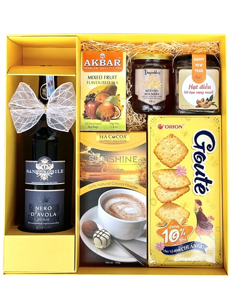 Loại rượu vang này kết hợp hoàn hảo với một giỏ quà hiện đại, đẹp mắt cực kỳ sang trọng trong đó bánh, kẹo, mứt, cà phê đều được chọn từ các thương hiệu cao cấp, uy tín. Các loại hạt được dùng trong phần quà là các hạt organic đầy đủ dinh dưỡng, lành mạnh và đảm bảo an toàn cho sức khỏe. Tất cả đều được chọn lọc cẩn thận kỹ lưỡng và kiểm soát chặt chẽ về nguồn gốc xuất xứ. Điều đó kết hợp tạo nên một món quà tuyệt vời!