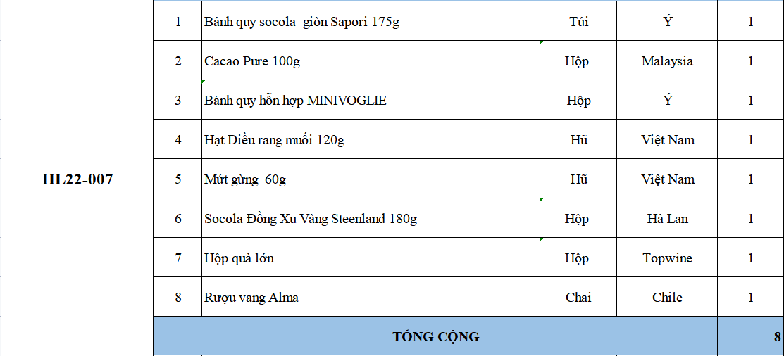 Các thành phần bao gồm: bánh kẹo, trà, cà phê, mứt, giỏ quà, hộp quà, nơ, ruy băng & rượu trong phần quà tặng đôi khi có thể bán hết hàng mà chúng tôi chưa kịp cập nhật. Nếu điều này xảy ra, chúng tôi sẽ xác nhận với bạn và luôn thay thế bằng các sản phẩm có giá trị tương đương hoặc lớn hơn.