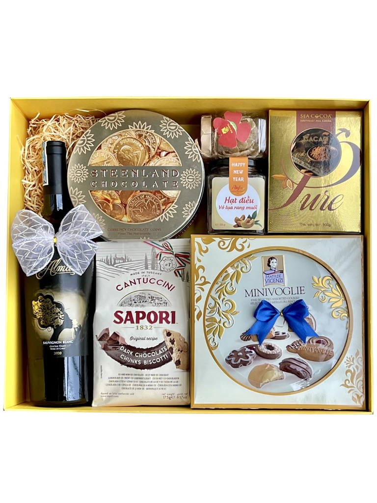 Loại rượu vang này kết hợp hoàn hảo với một giỏ quà hiện đại đẹp mắt cực kỳ sang trọng trong đó bánh, kẹo, mứt, cà phê đều được chọn từ các thương hiệu cao cấp, uy tín. Tất cả đều được chọn lọc cẩn thận kỹ lưỡng và kiểm soát chặt chẽ về nguồn gốc xuất xứ. Điều đó kết hợp tạo nên một món quà tuyệt vời!