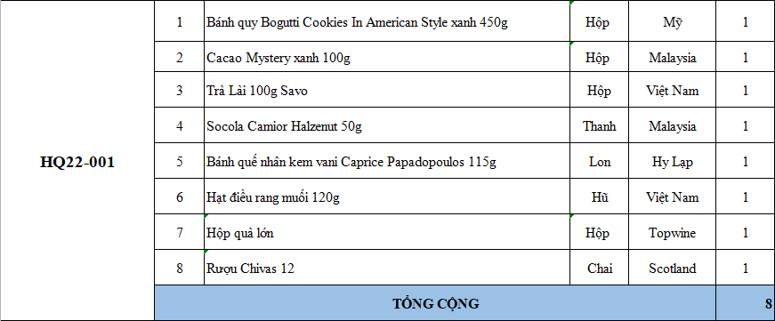 Các thành phần bao gồm: bánh kẹo, trà, cà phê, mứt, giỏ quà, hộp quà, nơ, ruy băng & rượu trong phần quà tặng đôi khi có thể bán hết hàng mà chúng tôi chưa kịp cập nhật. Nếu điều này xảy ra, chúng tôi sẽ xác nhận với bạn và luôn thay thế bằng các sản phẩm có giá trị tương đương hoặc lớn hơn.